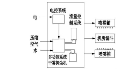 微米級干霧抑塵裝置采用模塊化設計技術由微米級干霧機、電控系統、螺桿式空氣壓縮機、儲氣罐、噴霧器總成、噴霧箱或萬向節噴霧器總成、水氣連接管線、電伴熱系統組成。